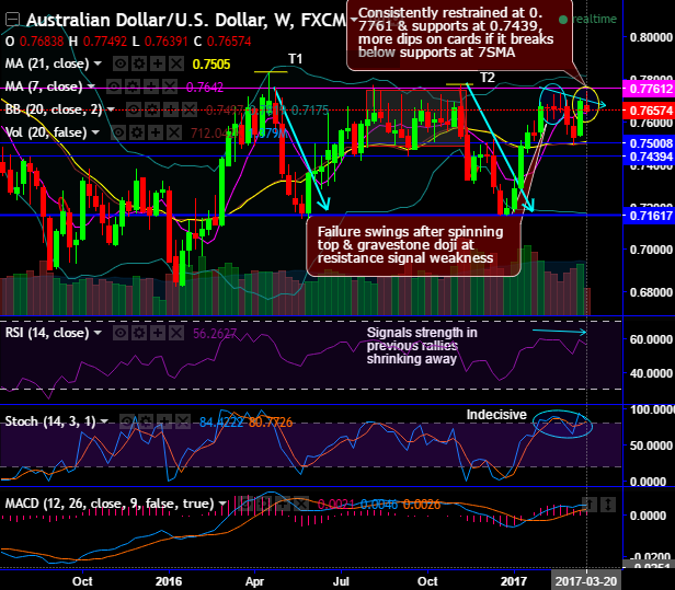 On weekly terms, ever since the bears have managed to reject the previous upswings at stiff resistance at 0.7761 levels, subsequently, we traced out shooting star, gravestone doji and spinning top candles at 0.7659, 0.7666 and 0.7667 levels.