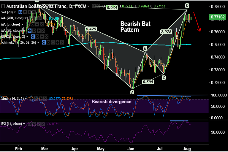 - We note a 'Bearish Bat Pattern' on AUD/CHF daily charts, scope for downside.
