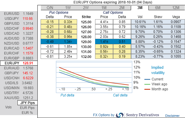 Most importantly, please be noted that the positively skewed IVs of 3m tenors are signifying the hedging interests in the bearish risks. The bids for OTM puts of these tenors signal that the underlying spot FX likely to break below 125 levels so that OTM instruments would expire in-the-money.