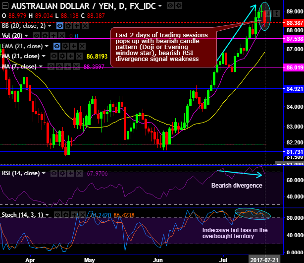 Last 2 days of trading sessions this pair pops up with bearish candle pattern (Doji or Evening window star), bearish RSI divergence signal weakness (daily charts).