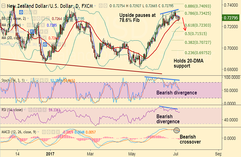 - NZD/USD is currently holding 20-DMA support at 0.7264, we see downside on break below.