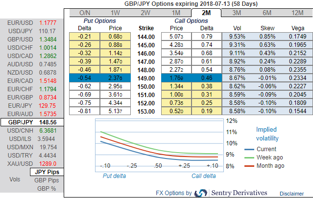 OTC updates: The OTC indications are also substantiating this bearish stance if you glance at the positively skewed IVs of GBPJPY of 2m tenors signify the mounting hedgers’ interests in OTM put strikes (bids upto 144 levels) and isn’t this a luring factor for a shrewd bear. While 2w/2m IVs of ATM contracts are trending between 8.5% - 9.5% that are the suitable combinations for diagonal ratio spreads structures.