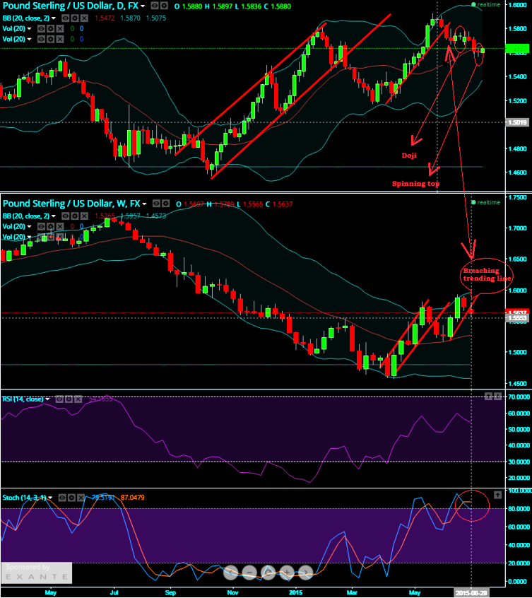 Doji and spinning top pattern candles occurred at 1.5743 and 1.5606 levels respectively to highlight the prevailing downtrend both on intraday and EOD charts.