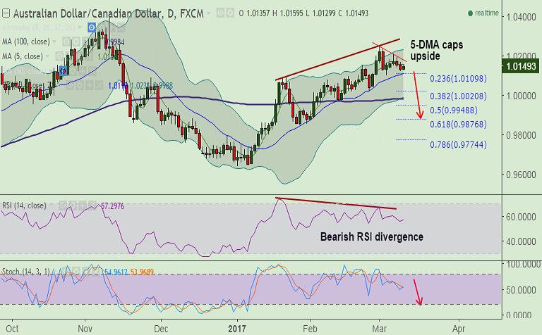 - AUD/CAD trades a narrow range, 5-DMA caps upside, intraday bias lower.