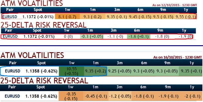 We keep urging often and often with spot FX flashes of EURUSD at 1.1379 delta risk reversal for 1 week contracts have shown bearish signals back again and long term (1M-1Y) put contracts are also on higher demand. Please be informed that comparison between risk reversal from last week to the current situations. EURUSD still maintains the top 3 highest implied volatility of 1W at the money contracts among G7 currency space, almost at 9.6%.
