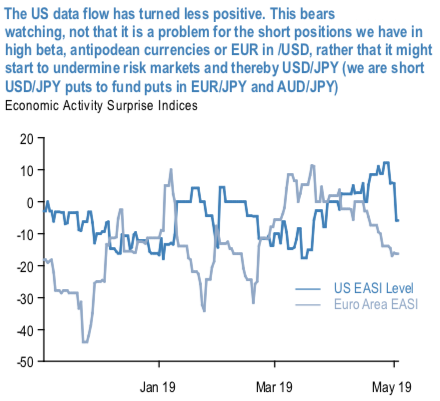 Should the dollar be particularly troubled by the slippage in the US data surprise index, which has dropped from +12 to -5 in the space of a week (refer 2ndchart)? We wouldn’t ignore this moderation in the US data flow since there has been an undoubted hint of US exceptionalism running through the dollar's recent good run. That being said, the US data surprises are still outperforming the Euro area, so we doubt whether softer US data can yet support EURUSD.