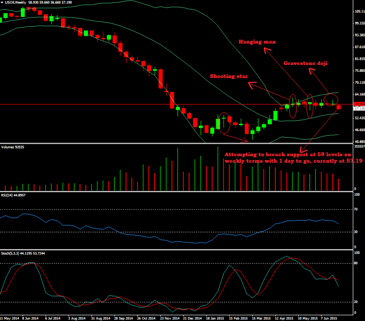 The prices have almost breached a crucial support at 59 levels with day to spare if it manages to break then we foresee all chances dragging until 55 levels. This Gravestone Doji appeared on a market top and the next candle also falls to the downside, it is a strong confirmation that the earlier doji's signal of market topping.