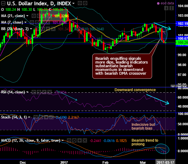 Short term trend seems a bit weaker as you could probably make out from the US dollar index dipping from the stiff resistance of 102.19 levels to head towards next immediate strong supports at 99.84 levels, not far from the recent lows of 99.23 as well, its lowest level since February 02nd.