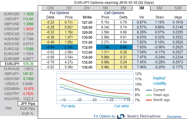 On hedging grounds initiate 3m longs in EURJPY (1%) OTM -0.39 delta puts for aggressive bears, simultaneously, deploy theta short in 2w ATM put options. If expiry is not near, delta movement wouldn’t be 1 point increase with 1 pip in the underlying spot FX. Which means if the spot FX moves 1 pip, depending on the strike price of the option, the option would also move less than 1.