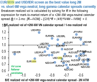 Subsidized gamma longs via +2M/-6M vega-neutral calendar spread that fade this curve steepness are good value in MXN and IDR.