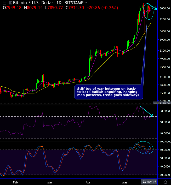 On the contrary, hanging man patterns have occurred at $8,005 and $7,955 levels to hamper the buying momentum, bulls, at this juncture, have halted the rallies momentarily, while bears are attempting to nudge below DMAs.