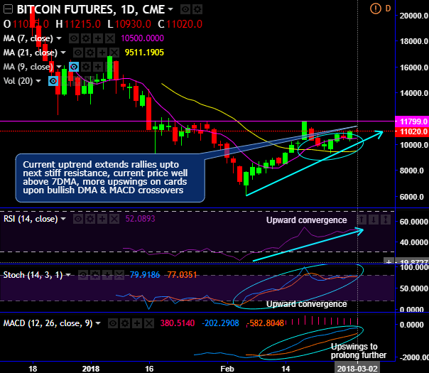 Bitcoin futures price on CME (BTC1!) for near month deliveries has formed hammer pattern candlestick at $8585 levels, ever since then the underlying price has been rising constantly above 7DMAs (Refer weekly plotting.