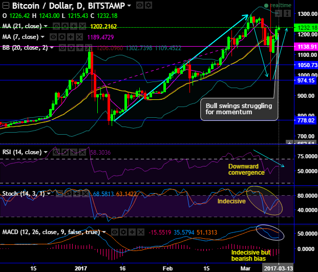After strong support at $975 (7EMA), BTCUSD has bounced back above DMAs to the current 1232 levels, while the leading oscillators have reached overbought zone (see monthly chart) and a decisive sustenance above DMAs would likely drag rallies swiftly up to the recent highs of 1275 and even 1350. Bitcoin has considerably spiked over 100% in the last week rising from $975.10.