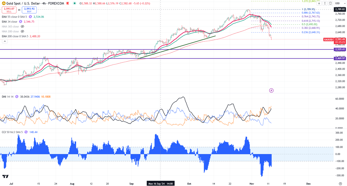 Gold remains below both short-term and long-term moving averages on the 4-hour chart. The immediate support level is around $2,580; a fall below this could lead to targets of $2540/$2500/$2470. A bearish trend would only be confirmed if prices drop below $2,470. On the upper side, minor resistance is found at $2,620, and breaking past this barrier could push prices up to $2635/$2665/$2700.