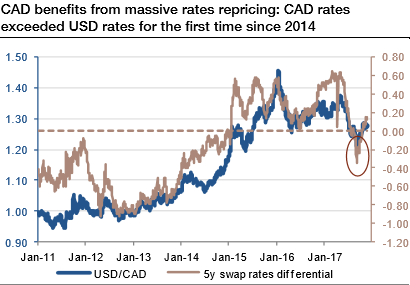 In loony’s fair assessment, the monetary policy to be more decisive than oil prices. The oil performance has been instrumental in boosting the currency in 2017, even though the long-term picture suggests that the currency has overshot the rebound in oil prices. However, the CAD is on the right track to remain strong: the interest rates factor is taking over from the commodity factor. CAD rates recently climbed above USD rates for the first time since 2014 (refer above graph), and our USD rates projections can realistically drag the USDCAD to 1.20.