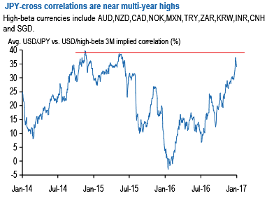 The concerted surge in the dollar since the US elections has lifted many boats, including correlations between USD/JPY and USD/high-beta pairs to multi-year highs that have historically offered stiff resistance (refer above chart).