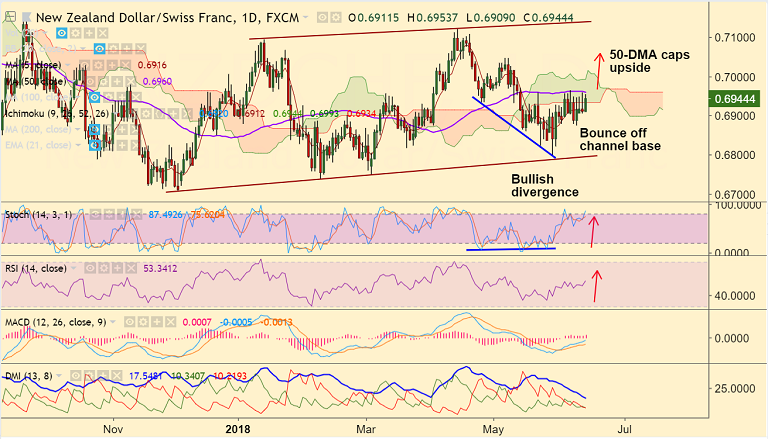 - The break has opened upside for the pair. 50-DMA is immediate resistance and we see scope for test of 0.70 levels on break above.