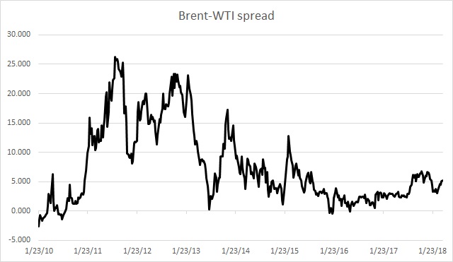 Unless the U.S. exports can keep up the pace with the production, which has increased by more than 2 million barrels per day since bottoming in July 2016. The current production stands at 10.46 million barrels per day. The bottlenecks (due to lack of transport) also keeps the North American benchmark suppressed against Brent.