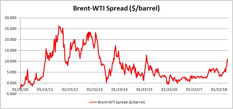 As the market turns its focus on tighter oil supplies from the Middle East amid heightened tensions surrounding Iran nuclear Agreement and Palestine Peace proposal and abundant oil supplies from the United States, the Brent-WTI spread has reached the highest level in 41 months, closing at $10.9 per barrel last week.