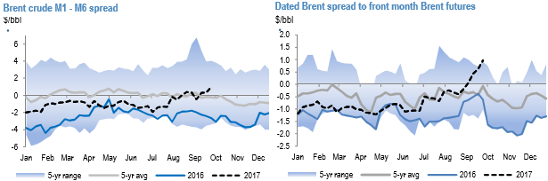 As a result of the bid from refineries in Atlantic Basin, crude markets have tightened further in recent weeks as still-healthy refining margins have lifted demand for crude. However, as we approach the end of 3Q’17 we expect this effect will likely fade. Nevertheless, Brent crude structure is back to levels last seen in mid-2014, (refer above diagram), as is Dated Brent pricing relative to front month Brent Futures, (refer above diagram).