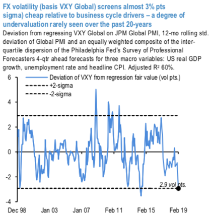 A year on from last year’s catastrophic VIX shock that by all accounts had drawn a line under 2017’s anomalous low volatility regime, February 2019 is ending with G7 FX volatility re-testing cycle lows from 1Q18. 1M ATM vols across the majors have now fallen well below 6.0 (EUR 1M 5.5, JPY 1M 5.6); even at such low levels, VXY G7 is arguably being held up artificially to some extent by the idiosyncratic Brexit premium in GBP options (GBP 1M 10.1) and perhaps a lingering trace of US/China tensions in AUD (1M 8.3).
