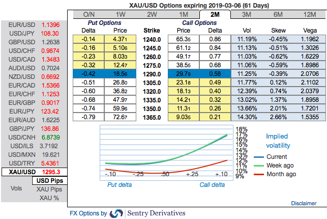 Bullish neutral risk reversals are observed in gold’s OTC hedging market, while positively skewed IVs of 2m XAUUSD options have been stretched out on either side.