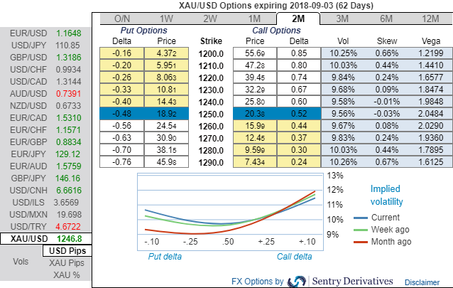 While 2m IV skews of gold (XAUUSD) options have been well balanced on either side and signify the hedgers’ interests on both OTM call and put strikes. While the combination of 1m bearish neutral remains intact with shrinking IVs is conducive for writing overpriced OTM calls. Using three-leg strategy would be a smart move to reduce hedging cost.