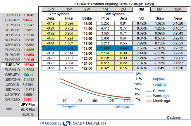 Most importantly, to substantiate the above indications, we could see some minor positive shifts in existing bearish risk reversal set-up of EURJPY that indicates the long-term hedging sentiments across all tenors are still substantiating bearish risks amid minor abrupt upswings in the short-term. Please be noted that 3m IVs are overall OTC barometer is noteworthy size in the forex options market that can stimulate the underlying forex spot rate.
