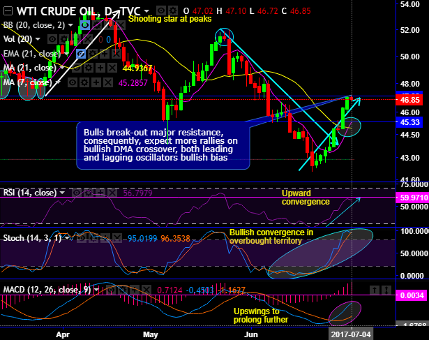 Bulls manage to break-out major resistances at 45.33 levels, consequently, expect more rallies on bullish DMA crossover, both leading and lagging oscillators seem to be bullish bias.