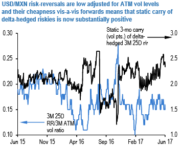 The peso has come a long way from its Trump lows and screens overbought and overvalued at current levels, leading our LatAm team to turn underweight recently. The standout feature of the USDMXN vol surface to us is the cheapness of risk-reversals, both vis-à-vis ATM vols and particularly relative to the amount of carry in forwards (refer above chart) that allows for carry efficient expressions of bearish directional views or tail risk hedges.