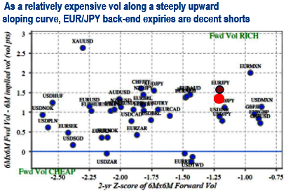 For those willing to countenance outright vol shorts, expensive back-end vols on steep vol curves of relatively lower-beta yen-crosses such as EURJPY appear to be decent targets (refer above chart); this also meshes with the previous theme of a period of quiet on Euro crosses.
