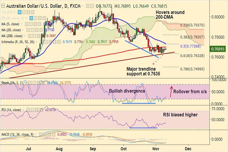 Support levels - 0.7673 (5-DMA), 0.7635 (trendline), 0.7625 (Oct 27 low), 0.7571 (July 5 low)