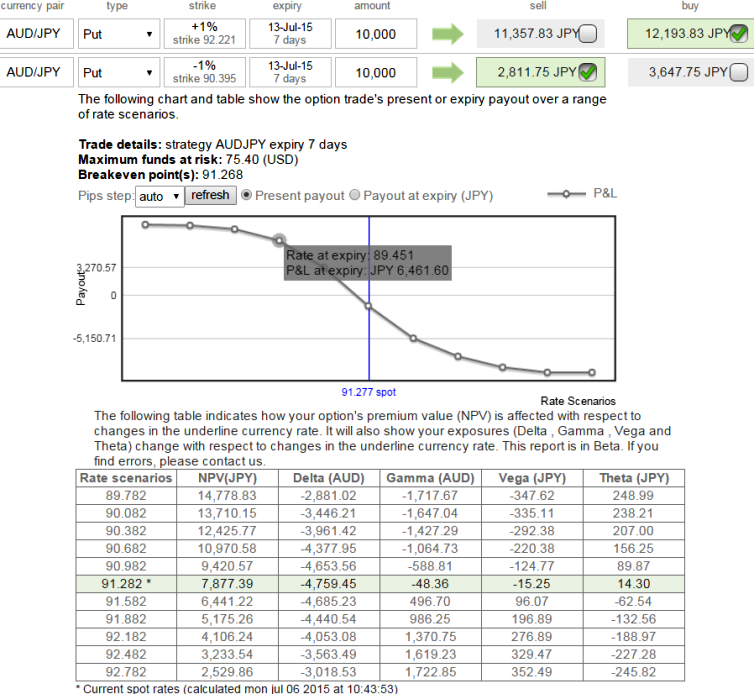 With a view being bearish bias we recommend buying 7D (1%) In-The-Money 0.74 delta put option while sell 7D (-1%) Out-Of-The-Money put options for a net debit (something like USD 9391.83 as shown in the diagram).