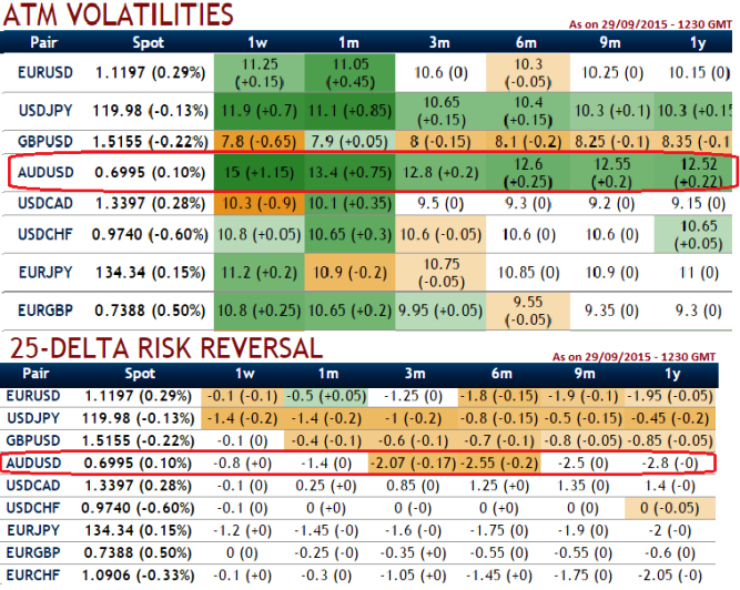 With spot FX flashes of AUDUSD at 0.6995 we see delta risk reversal for 1 week contracts have shown slight recovery signals but long term (1M-1Y) put contracts are on higher demand. As you can make out from the nutshell showing AUDUSD still maintains the highest implied volatility of 1W at the money contracts among G20 currency pool, almost at 15%.