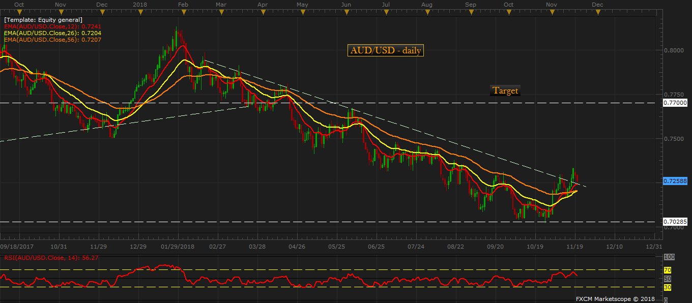 As the dollar continues to exert weakness across the board, and as the Australian economy showing remarkable resilience with economy growing at 3.4 percent y/y in the second quarter of 2018 with unemployment rate hitting 5 percent, despite steady increases in the participation rate, we believe that conditions are currently right to go long on the Australian dollar, based on our calculations.