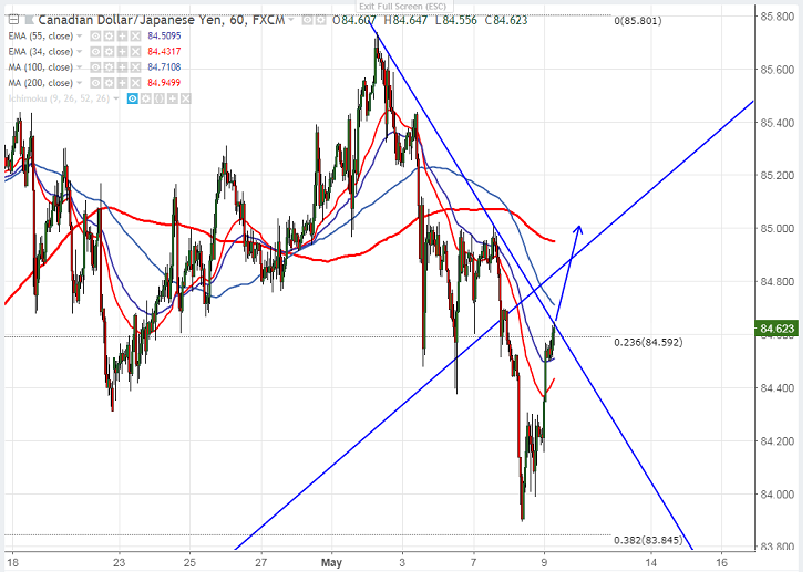 - The pair’s major near term resistance is around 84.65 (trend line resistance) and any break above will take the pair 85/85.40/85.78.