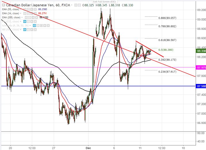 - CAD/JPY formed a minor bottom at 87.50 and shown a minor jump on account of rising crude oil prices. Brent crude oil price s jumped above $65 high since 2015. The reason for rise was mainly due to North sea pipeline shutdown. The pair hits intraday high of 88.349 and is currently trading around 88.32.