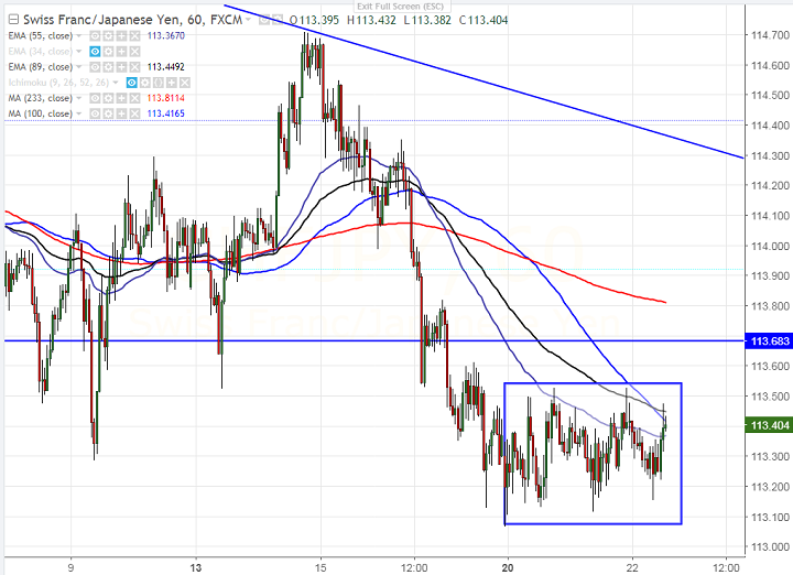 - CHF/JPY is consolidating for the past two days after hitting low of 113.06 on Nov 19th 2017. The pair hits high of 113.52 at the time of writing. It is currently trading around 113.40.