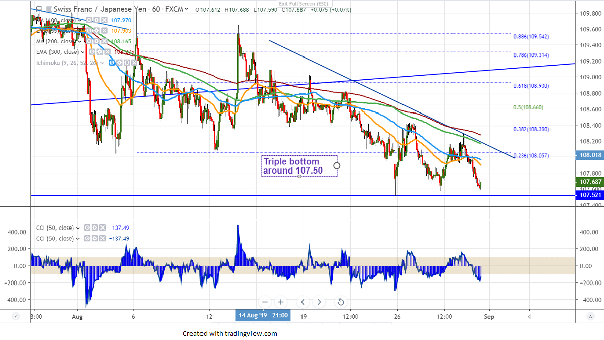 CHFJPY is trading lower for 2nd consecutive days after a minor recovery till 108.28. The easing of the US-China trade war was one of the major reasons for pair decline. It hits an intraday low of 107.58 and is currently trading around 107.609.