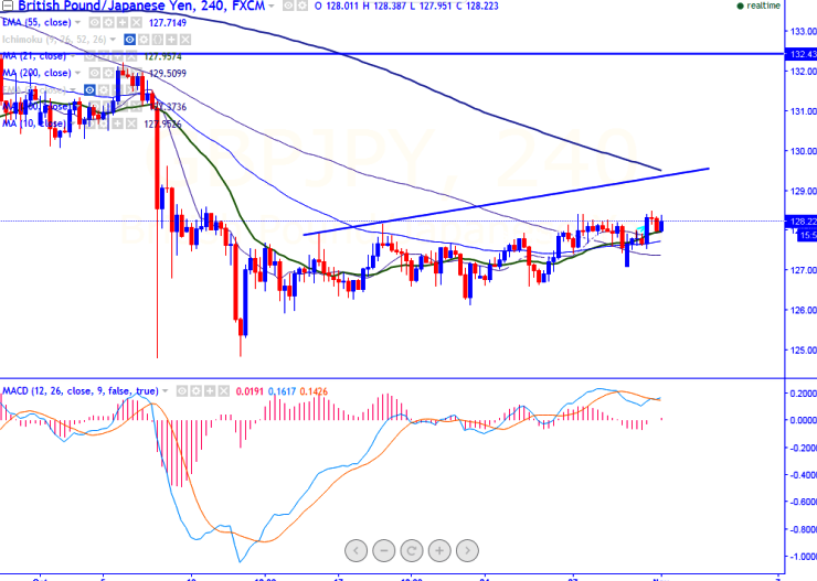 - Major resistance – 128.50 (trend line joining 128.17 and 128.41).