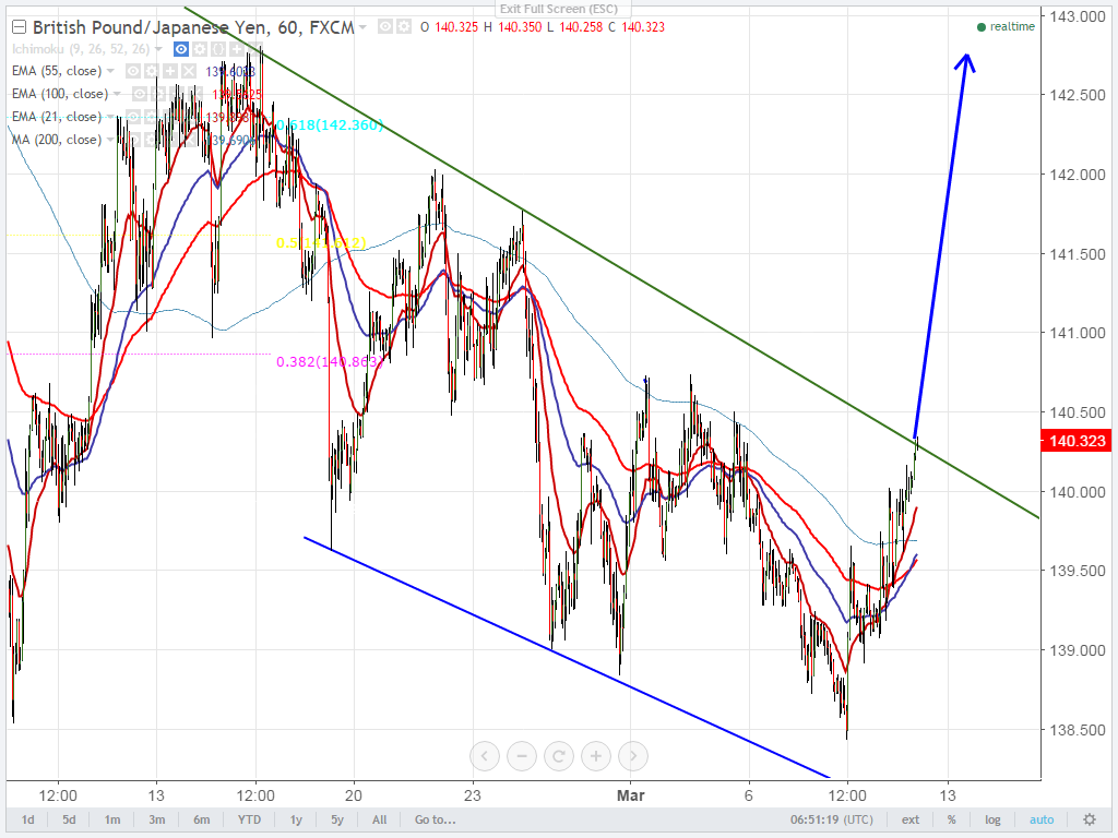 - GBP/JPY was trading in narrow channel for the past ten trading session and is expected to close above the trend line resistance for the first time in ten days. It is currently trading around 140.30.