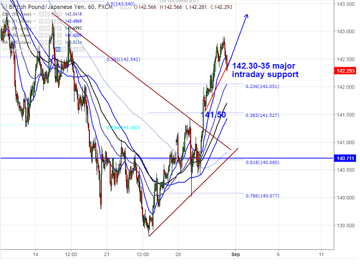 - The downside is capped by minor trend line support at 142.30 (trend line joining 141.56 and 141.80) and any break below will drag the pair down till 142.05 (23.6% retracement of 139.30 and 142.90)/141.40 (100- HMA).Minor bearishness can be seen below 141.40.