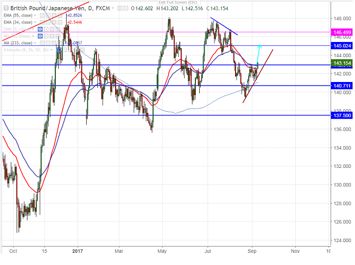 - The pair’s major resistance is around 143 high made on Sep 1st 2017 and any convincing break above will take the pair to next level till 144.66 (61.8% Fibo)/145.27 (Aug 8th high).