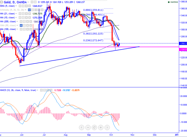 - The yellow metal formed a temporary bottom around $1250 and is struggling to break below that level. It is currently trading around $1260.