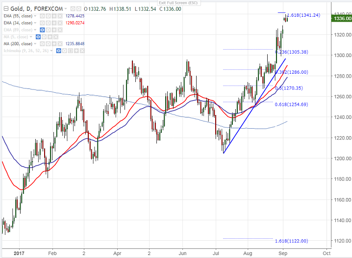- Technically gold is facing major resistance around $1343 and any break above will take the yellow metal to new year high at 1353 (161.8% retracement of $1295 and $1204.35)/$1377.50 Jul 2016 highs.