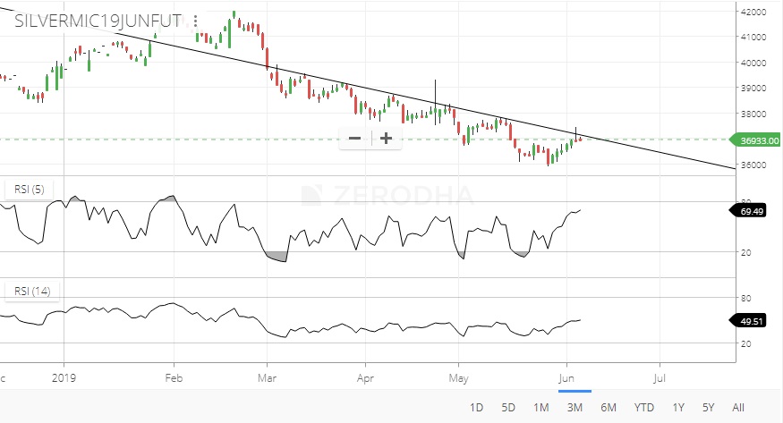 The chart pattern shows above strongly suggests a short silver against INR, at least in the short run. The chart, prepared Kite charting software of Zerodha, clearly shows Silver June contract, and the price action forming a bearish inverted hammer candle in the daily chart and a crucial down trending resistance line.