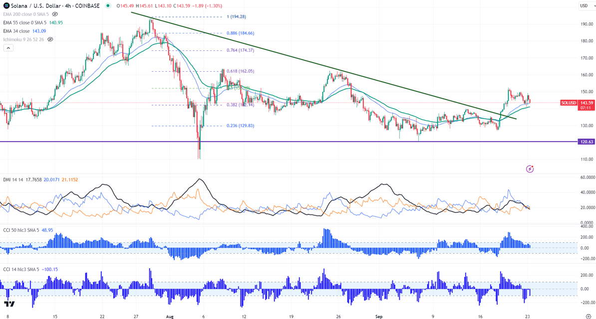 SOLUSD consolidating between $152.41 and $141 for the past three days. The pair holds above the short-term (34 and 55 EMA) and long-term moving average in the 4-hour chart. It hit a low of $141 and is currently trading around $143.60.