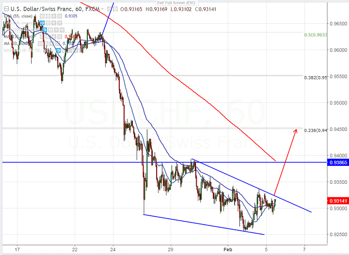- USD/CHF is consolidating after hitting low of 0.92556 on Feb 2nd. The pair is trading between 0.93368 and 0.92550 for past two trading session. It is currently trading around 0.93155.