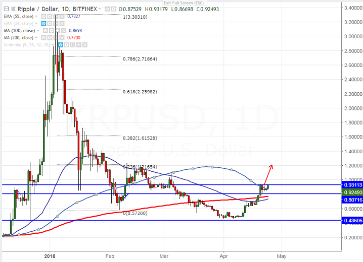 - Ripple has shown a good recovery after three days of consolidation. The pair hits intraday high of 0.93180 and is currently trading around 0.92600.The pair has jumped almost 46% previous week. Overall trend is bullishness as long as support 0.4500 holds. Any further weakness only below that level. It is currently trading around 0.92862.