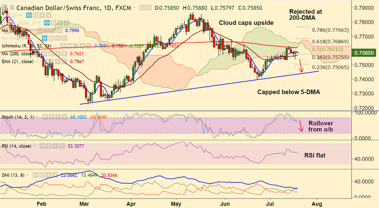 Resistance levels - 0.7590 (5-DMA), 0.7621 (200-DMA), 0.7686 (61.8% Fib)